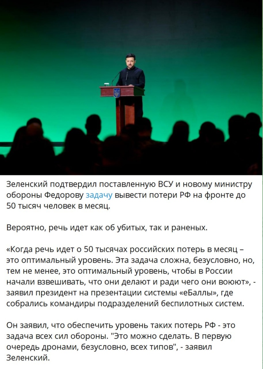 Военная цель может быть измерена оперативными показателями (контроль территории, разрушение логистики, лишение противника манёвра) и прежде всего зависит от собственных действий. Военная цель обычно формулируется в терминах конкретных тактических или стратегических достижений, которые напрямую влияют на исход боевых действий. Зеленский даже не может сформулировать, как это повлияет на ход боевых действий. «Чтобы в России начали взвешивать» — это не результат. Потери вообще никогда не были управляемой величиной в истории войн. Потери противника зависят от его тактики, плотности войск, логистики. Ни один генштаб не ставил задачу в виде числа убитых и раненых противника. В истории есть единственный пример, где подсчёт потерь противника был вписан в некую метрику победы. В ходе Корейской войны командование сил ООН (де-факто США) активно использовало метрику «kill ratio» — соотношение собственных потерь к потерям противника. Однако этот эпизод показывает ошибочность подхода: даже если
