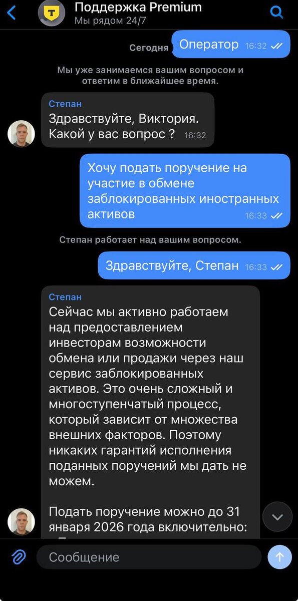 🤝 Некоторые брокеры начали собирать заявки на обмен иностранных бумаг на российские. Очень тихо так, незаметно, никого не ставя в известность :) Видимо боятся, что возникнет избыток предложения акций, которые удалось обменять. 🤔Как узнала я? Большое спасибо моим юридически подкованным подписчикам, которые со мной с основания этого канала, для меня это показательно и очень ценно 🐈Для всех кто инвестирует достаточно давно и успел стать владельцем заблокированных активов, рассказываю как подать заявку: 1. Вызываем оператора в тех.поддержке 2. Пишем фразу «Хочу подать поручение на участие в обмене заблокированных иностранных активов» 3. Далее вы можете видеть объяснение и переписку на скринах. Заявка подается буквально за минуту Казалось бы чудо) Но финальные условия обмена не ясны, а сроки могут быть очень затянуты, как и вообще физическая возможность провести подобные транзакции в зарубежных депозитариях. С заботой о вас и ваших деньгах 🫶🏻