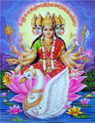 В индийской мифологии Гаятри — это имя жены Бога Брахмы, солнечной дочери Бога Сурьи (отсюда ее второе имя «Савитри» — солнечная). Она — женская ипостась Всевышнего, «Ведамата» — мать четырех Вед, истинного знания, которое она передала человечеству. Считается, что секрет учения Упанишад заключен в четырех Ведах, а Гаятри — сущность Упанишад.