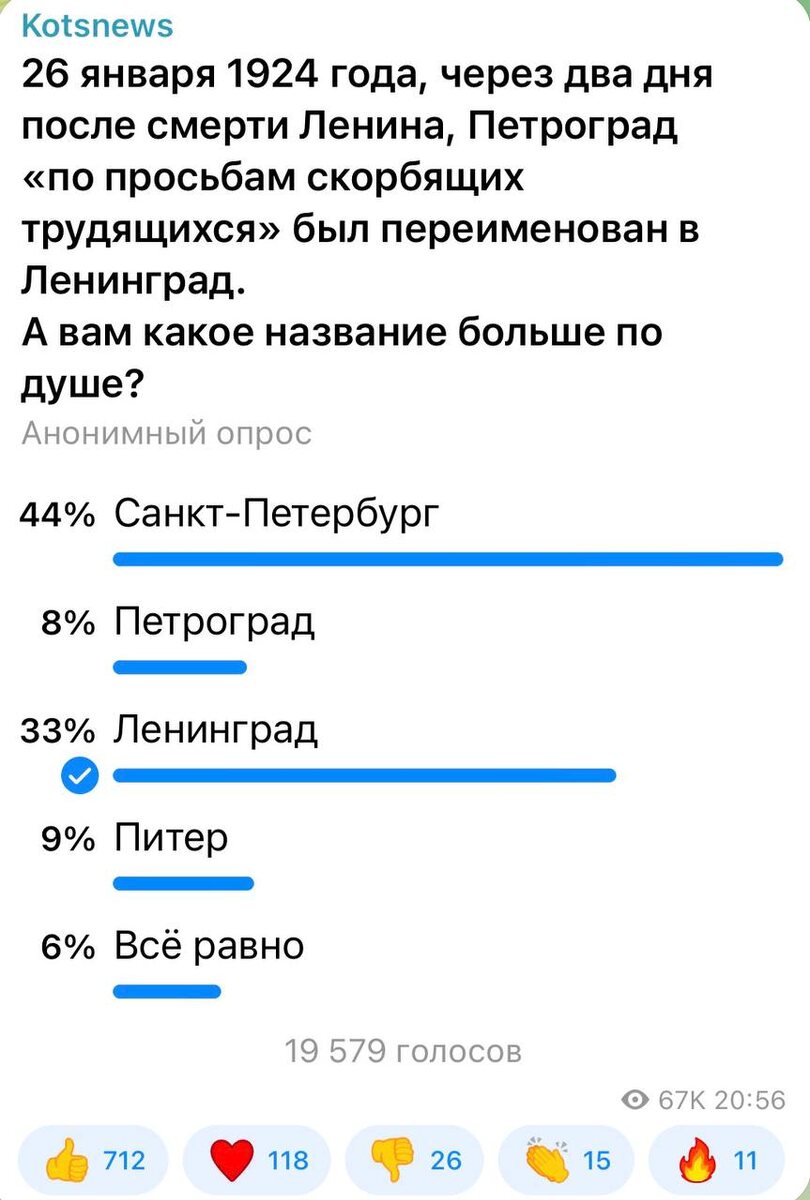 ⚡️⚡️⚡️ 44 процента подписчиков согласны с нынешним названием города - Санкт-Петербург. Ну хоть область - Ленинградская. И блокаду вроде не переименовывают.