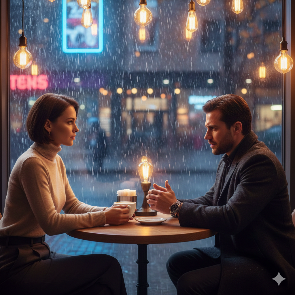 Дверь кафе распахнулась, впуская порцию холодного воздуха и мужчину в дорогом, но насквозь промокшем пальто. Он стряхивал капли с зонта, когда их взгляды встретились.