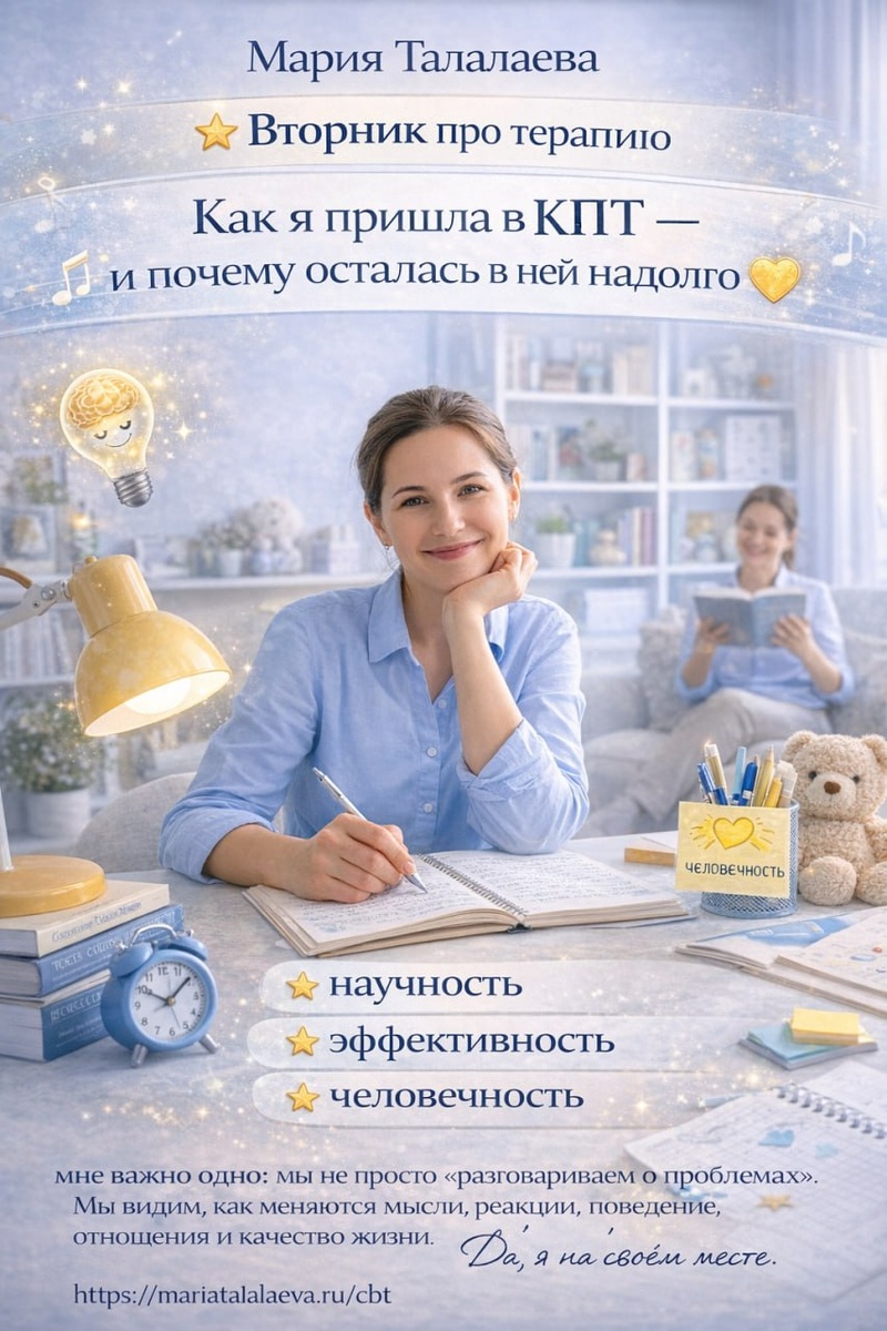 Как я пришла в КПТ — и почему осталась в ней надолго Когда я училась в институте, мне хотелось попробовать всё. Классическое консультирование, элементы психоанализа, краткосрочные подходы, гипноз. Казалось: чем больше техник я знаю, тем больше смогу помочь. Но с практикой пришло другое ощущение. Я всё чаще ловила себя на вопросах: почему это работает именно здесь? а почему в другом случае — нет? что на самом деле меняет жизнь человека, а что просто звучит красиво? Мне не хватало структуры. Не хватало ясности. Не хватало опоры на реальные механизмы психики, а не только на интуицию. И тогда я начала углубляться в доказательные подходы. Диалектическая поведенческая терапия и радикально открытая ДБТ буквально «попали» в мои ценности. В них есть уважение к человеку — без обесценивания и давления. И одновременно — твёрдость, логика, ясные шаги. Мне стало спокойно работать: я понимала, что, зачем и как мы делаем. И именно через эти направления я пришла к когнитивно-поведенческой терапии. КПТ
