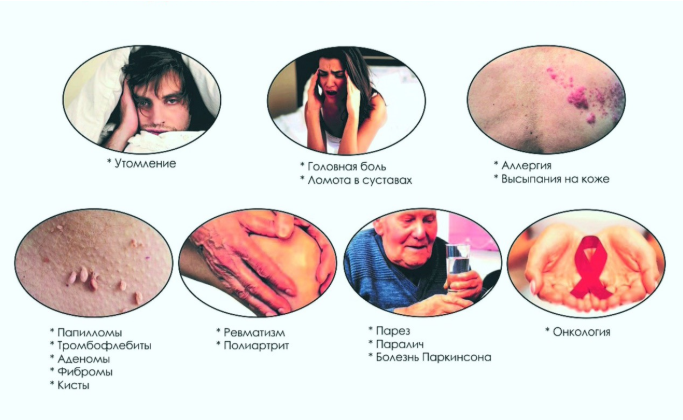 Выставляются такие диагнозы: синдром хронической усталости, мигрени, гипертоническая болезнь, атеросклероз, ревматоидный артрит, бронхиальная астма, гепатозы.