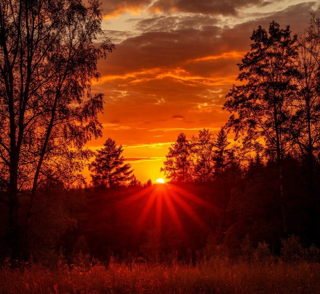 Солнце медленно опускалось за лес, окрашивая небо в тёплые оттенки оранжевого.