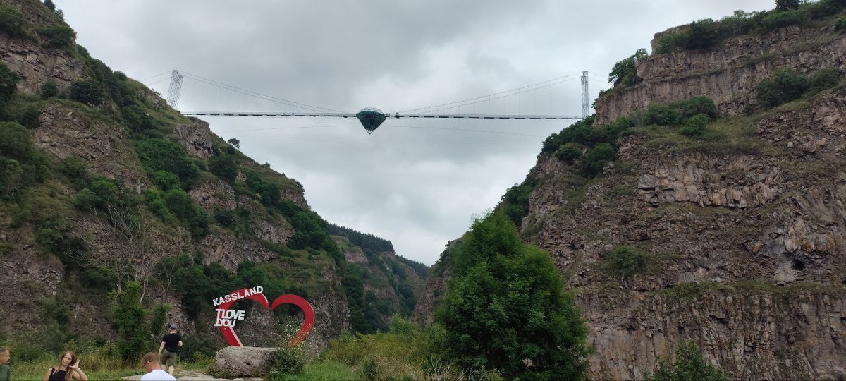 Наконец, мы идём по подвесному мосту к стеклянной архитектурной конструкции, напоминающей по форме бриллиант. Она расположена в центре каньона. Когда я читала о Дашбаши, мне показалось, что мост через каньон будет полностью стеклянным, но в реале это не так. Да, на входе есть несколько стеклянных блоков, но там нет еще той головокружительной высоты, как в центре. А наблюдать траву и цветы в нескольких метрах под ногами может и красиво, но не впечатляет.