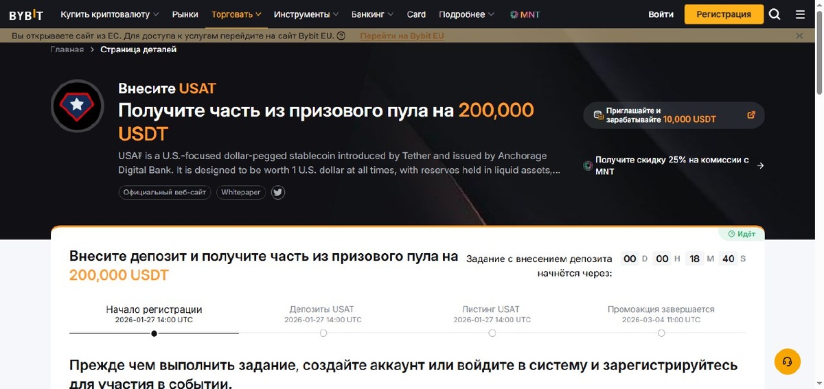 💻 Что делать? ➡️ Регистрация на Bybit 🟠 TS USAT Для новых Делаем депозит 100 и объем 100 Награда: 15 USAT Листинг: 27.01 14:00 UTC ⏰ Начало регистрации: 27.01 14:00 UTC Мест: 10,000 🟠 TS USAT Для старых Делаем депозит 1,000 USDT и объем 1,000 USDT Награда: 10 USDT Мест: 5,000 👉 Купить кус можно в NVS SHOP 👉 Прокси беру на proxyline промо AllWin 👉 Антидетект браузер ADS промо на 5% ALLWIN5 ❕ Гайд по созданию фермы