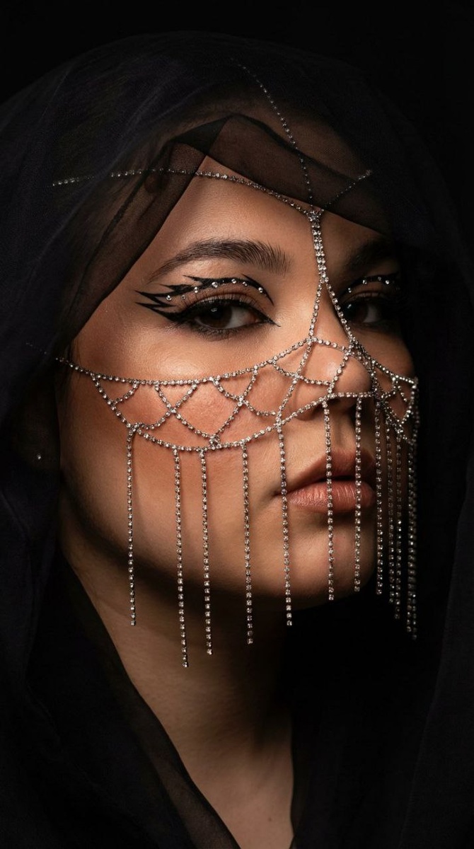 : 😀Заходим в этот бот или в этот 😀Выбираем "нейросети" 😀Нажимаем "Nano Banana" 😀Нажимаем "Nano Banana Pro" 😀Прикрепляем через скрепку свое фото и выбранный промпт 😀Наслаждаемся результатом😍 > Не меняя внешности женщины с фото, перед нами предстает крупный план её лица, частично покрытого прозрачным чёрным платком, который создаёт легкую дымчатую вуаль вокруг головы и акцентирует внимание на её выразительных чертах. Глаза подчёркнуты необычным графичным макияжем — ярко чёрной стрелкой с зубчатыми окончаниями, гармонично дополненной отдельными блестящими кристаллами, аккуратно выложенными вдоль линии ресниц. Тон кожи ровный, с нежным мерцающим бронзовым румянцем, создающим эффект тепла и мягкости. Особое впечатление производит изысканный головной убор — тонкие цепочки с маленькими сверкающими стразами, плотно обрамляющие лицо вертикально и горизонтально, как сетка, ниспадающая кистями вниз по щеке и образующая подобие причудливой маски, через которую слегка проглядывают черты лиц