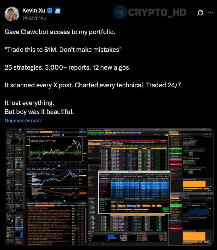 … Kevin Xu дал AI-агенту Clawdbot доступ к своему криптопортфелю. Промт: «Натрейдить $1,000,000. Не ошибаться». Искусственный интеллект использовал 25 стратегий. Создал более 3000 отчетов и 12 новых алгоритмов. Сканировал каждый пост в Twitter, строил графики по всем техническим параметрам. Торговал круглосуточно. Итог: AI-агент потерял все деньги, но «это было невероятно красиво». Cryptо Headlines