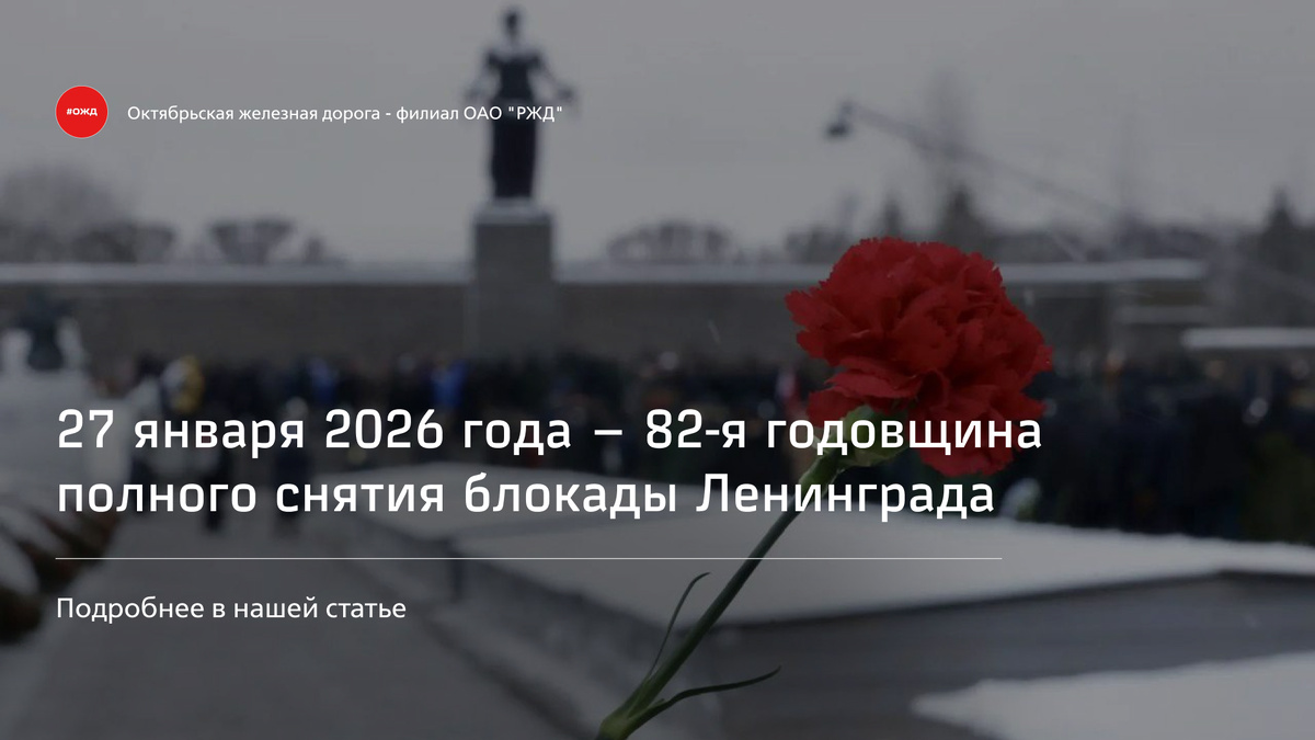 К колонне шествия на Пискаревском мемориальном кладбище присоединились руководители железной дороги, представители совета ветеранов и комитета молодёжи магистрали. 18 января 1943 года Советская Армия прорвала блокаду Ленинграда. В полосе прорыва за 17 суток была построена железнодорожная линия Поляны – Шлиссельбург, соединившая осажденный город со страной спустя полтора года отсутствия прямого сообщения. Именно по ней была переброшена вторая ударная армия, которая с Ораниенбаумского плацдарма начала операцию «Январский гром», полностью освободившую Ленинград от вражеской блокады 27 января 1944 года. Делегация ОЖД возложила венки к монументу Мать-Родина в память о защитниках города на Неве и к памятному знаку железнодорожникам – героям Великой Отечественной войны, павшим при защите Блокадного Ленинграда и на фронтах Великой Отечественной войны.