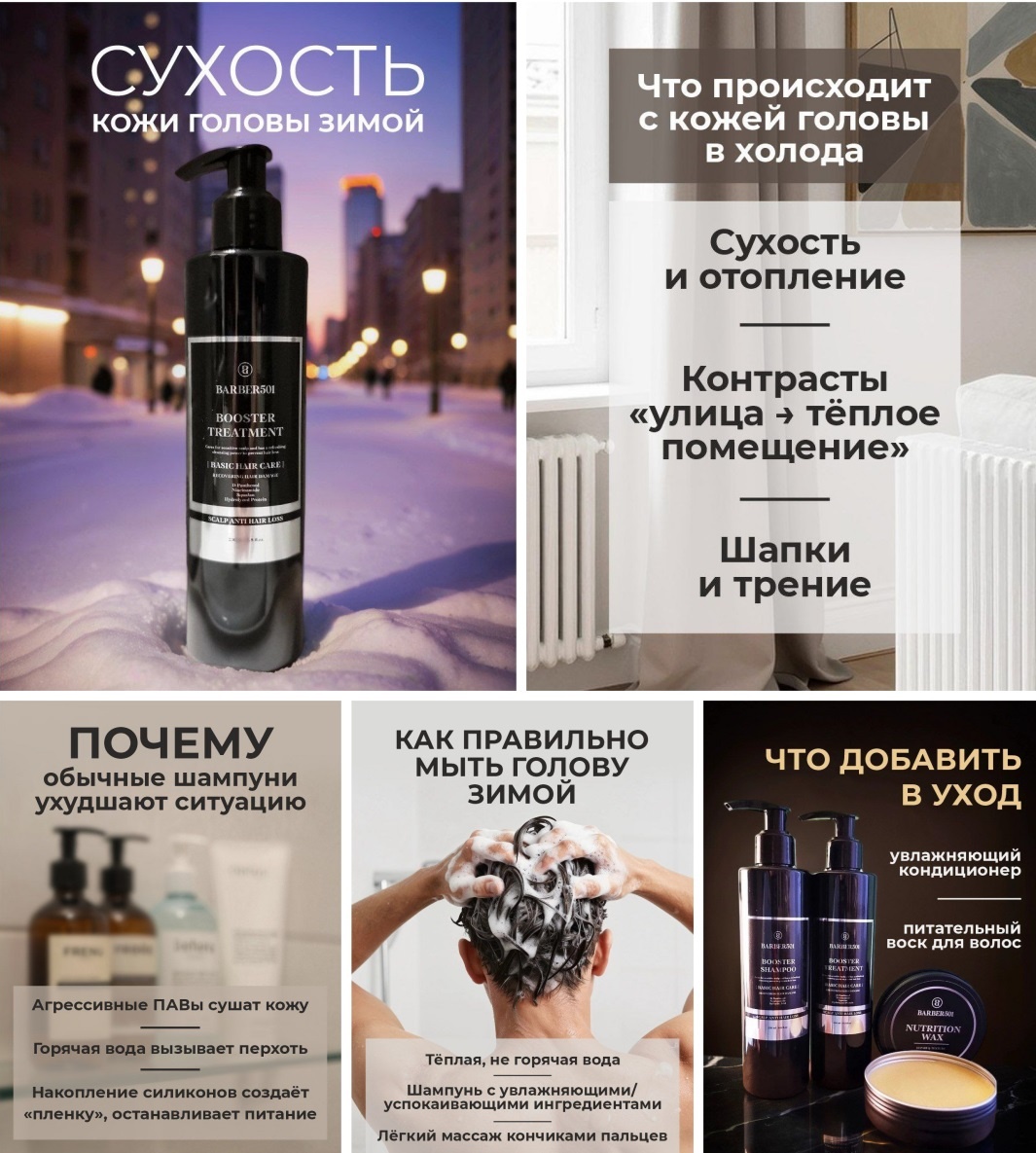 Почему зимой кожа головы сохнет и что с этим делать ❄️🧑🦱 Отопление 🔥, шапки 🧢, холодный воздух 🧊 - всё это создаёт стресс для кожи головы. Она начинает шелушиться, появляется зуд, перхоть становится заметнее. Многие мужчины в ответ начинают мыть голову чаще, но это только усугубляет проблему - кожа пересушивается ещё сильнее. ▪️ Используйте мягкий шампунь 🫧 - агрессивное очищение разрушает защитный слой ▪️ Не мойте голову слишком горячей водой 🚿 - это провоцирует избыточную выработку себума ▪️ Добавьте средство с успокаивающими компонентами 🌿 - кожа головы нуждается в восстановлении ▪️ Носите шапки из натуральных материалов 🧶 - синтетика усиливает раздражение 🇰🇷 BARBER501 создаёт шампуни с мягкой формулой, которые очищают, не нарушая баланс кожи головы. Зимой это особенно важно - когда кожа и так находится под нагрузкой. ✅