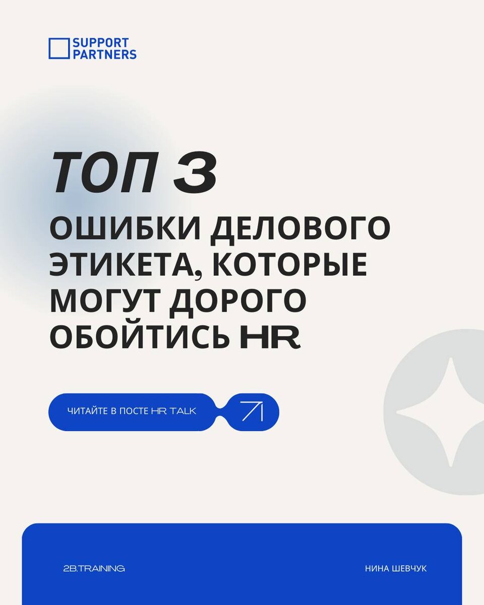 Не устану говорить, что деловой этикет — это далеко не про то, как держать вилку или бокал шампанского, хотя и это знать очень важно. На самом деле это куда более широкая область деловой коммуникации: невербальная речь, самопрезентация, деловая переписка и правила рассадки за столом переговоров. Все это формирует впечатление о компании. Рассказала о наиболее распространенных промахах, которые портят первое впечатление о компании и об HR. О том, какие привычки эйчарам стоит пересмотреть прямо сейчас, чтобы не тратить потом силы на восстановление репутации, я рассказала в посте для HR Talk Support Partners. #деловой_этикет