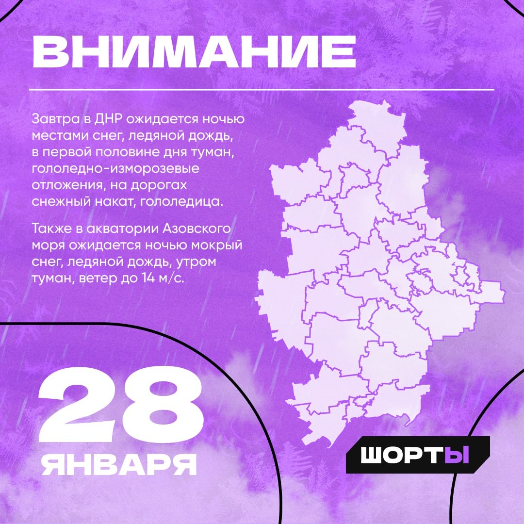 Завтра в ДНР ожидается ночью местами снег, ледяной дождь, в первой половине дня туман, гололёдно-изморозевые отложения, на дорогах снежный накат, гололедица. Подписаться | Написать нам | Дзен