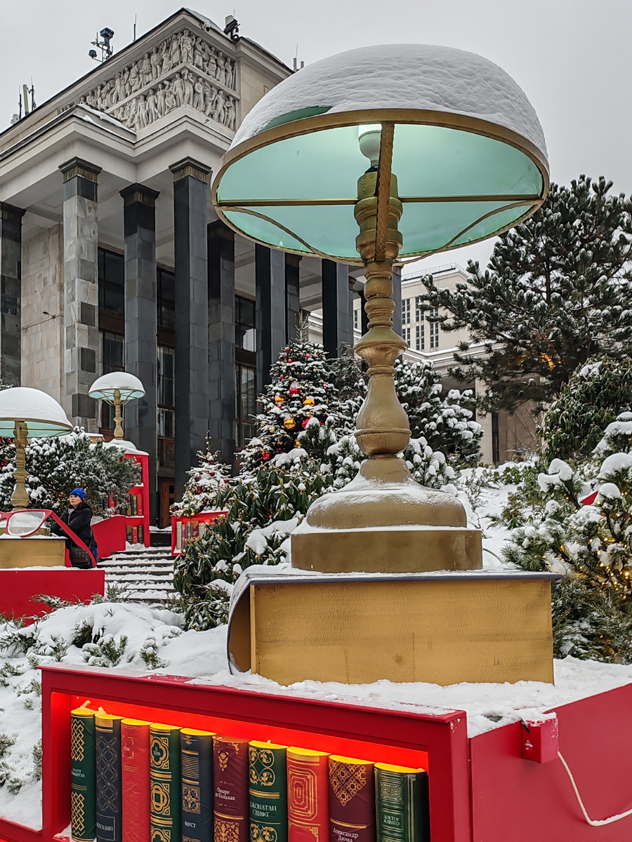 Новогодняя локация у Библиотеки им.В.И.Ленина, оформлена в виде читального зала.