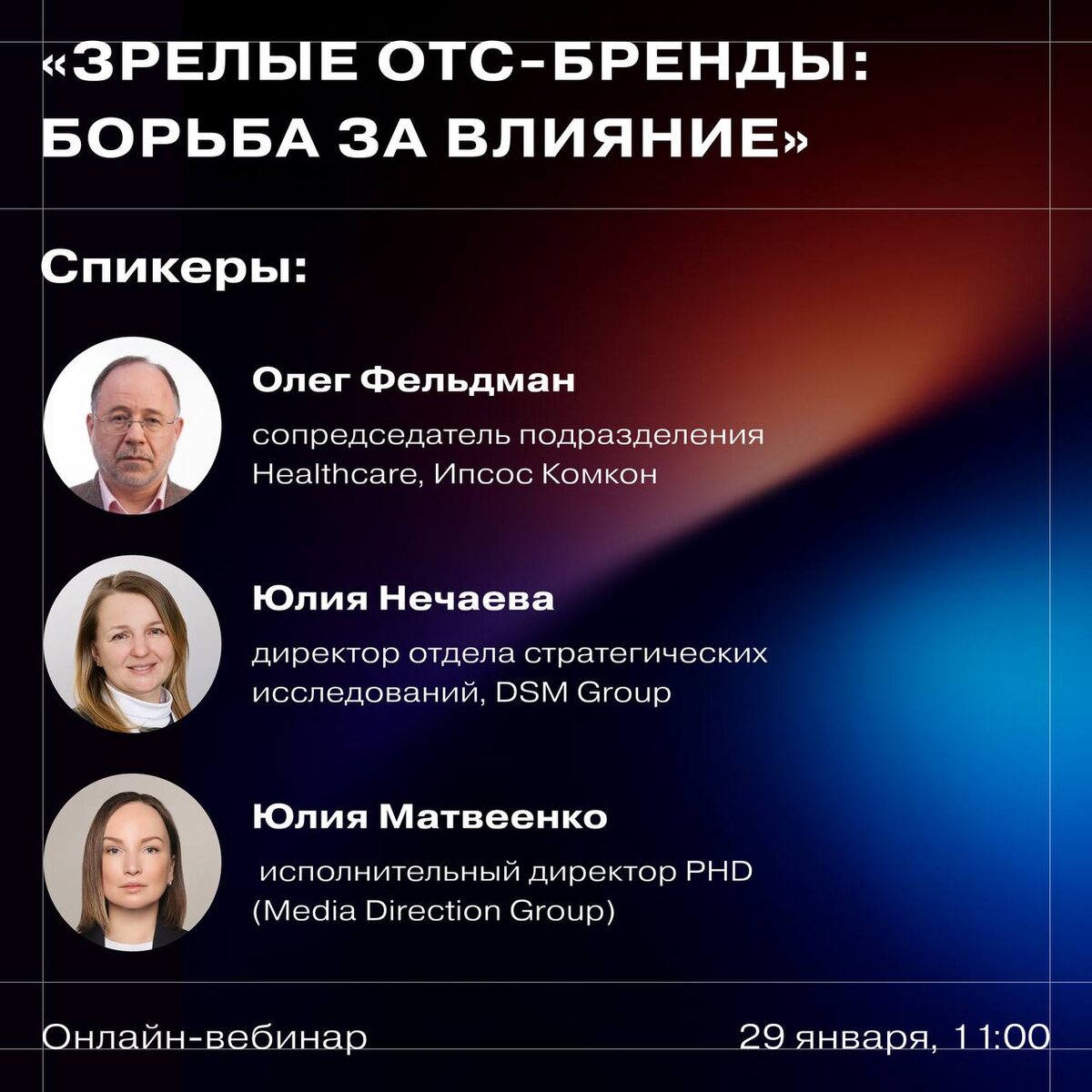 ? 🗓 Продолжаем анонс вебинара «Зрелые OTC‑бренды: борьба за влияние» (29 января, 11:00 Мск). На вебинаре выступят спикеры: ✔️ Олег Фельдман — сопредседатель подразделения Healthcare, Ипсос Комкон ✔️ Юлия Нечаева — директор отдела стратегических исследований, DSM Group ✔️ Юлия Матвеенко — исполнительный директор, PHD (Media Direction Group) Кроме спикеров с данными, в эфире будут эксперты из фармкомпаний. Они помогут валидировать гипотезы, перевести цифры в практику и обсудить, что реально работает у зрелых брендов и что помогает новым игрокам быстро отъедать долю. Эксперты в эфире: ✔️ Любовь Лемешева — руководитель отдела маркетинга ОТС, Сотекс ✔️ Антон Федосюк — директор по маркетингу, Биннофарм Групп ✔️ Сергей Трифонов — исполнительный директор, Промомед Главный вопрос вебинара: ➡️ Какие стратегии и какой уровень поддержки нужны зрелому OTC‑бренду, чтобы удерживать влияние и долю? ➡️ И какие агрессивные действия новых игроков реально дают результат? Формат максимально диалогов