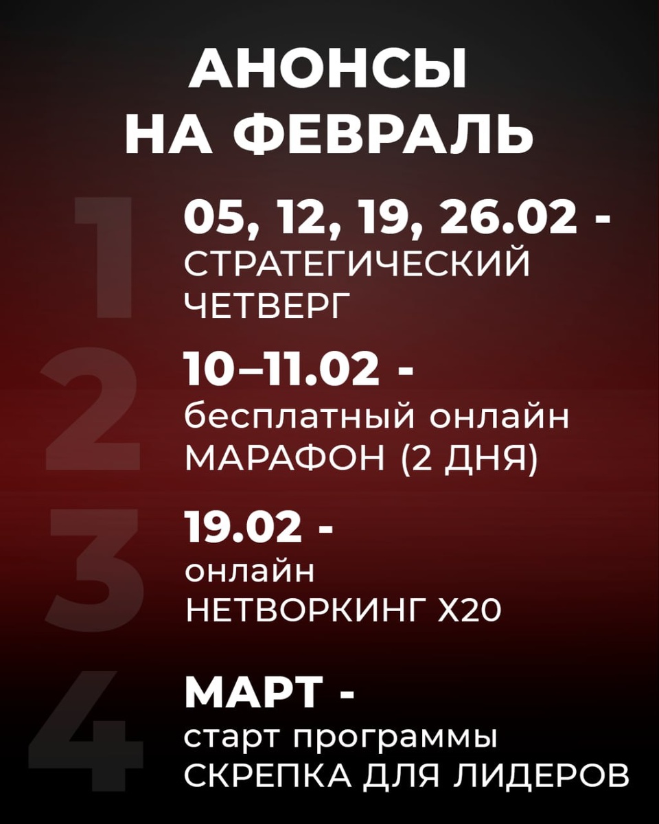 Собрал ближайшие события на февраль и март, чтобы вы заранее понимали, где можно подключиться: 🔘05, 12, 19, 26 февраля - Стратегический четверг Весь февраль возвращаем стратегические четверги, будем встречаться, общаться, разбирать управленческие вопросы и фиксировать решения 🔘10–11 февраля - бесплатный онлайн-марафон Базовые инструменты роста За два дня разберём набор базовых инструментов, которые чаще всего дают прирост, когда в бизнесе много действий, а ясности и структуры не хватает: на что опираться, что измерять, где искать точки усиления, как собирать план и не терять его в операционке. 🔘19 февраля - онлайн-нетворкинг Х20. Где можно познакомиться, обсудить текущие задачи и продолжить общение после созвона 🔘Март - старт программы Скрепка для лидеров. Это программа для тех, кто хочет системно пройтись по управлению и росту, держать регулярность и двигаться по шагам, когда вокруг постоянно меняются обстоятельства. 🔻 Сохраните, чтобы не потерять даты 🧡 Поставьте реакцию ✈
