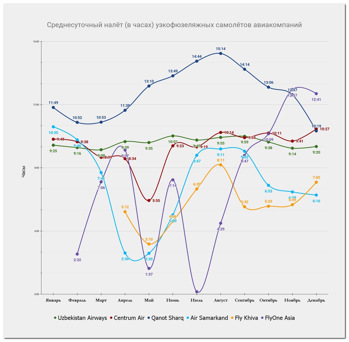 Среднесуточный налёт (в часах) узкофюзеляжных самолётов местных авиакомпаний