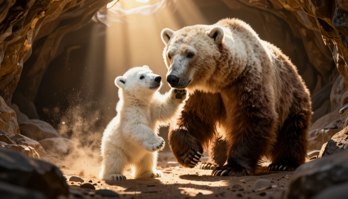 Прошло несколько месяцев. Рана Айны окончательно затянулась, оставив лишь светлый шрам — память о прошлом и знак силы. Её медвежонок, пушистый комочек, который теперь больше походил на озорного белого медвежонка с глазами-бусинками, носился по тайге, вызывая удивление и улыбки у всех обитателей. Но у него до сих пор не было имени. Айна ждала знака от нового дома. И знак пришёл. Однажды утрь медвежонок, пытаясь поймать солнечного зайчика на стене берлоги, встал на задние лапки. Луч солнца, пробившийся через сосновую хвою, упал ему прямо на лоб, заставив сиять белую шёрстку, как снег в ясный день. «Солнечный», — тихо сказал Космач. — «Он принёс с собой холод, но в нём самом живёт наше, таёжное солнце. Пусть будет Солныш». Айна мурлыкающе согласилась. Так у белого медвежонка появилось имя, данное новым отцом.