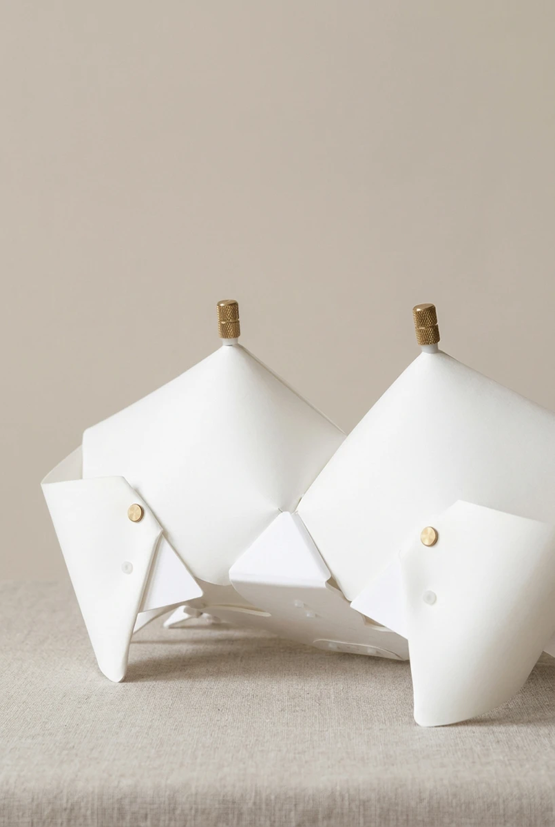 Токийская студия Metal Goat представила настольную лампу Oogani — светильник, который выглядит как живое существо, застывшее в геометрической форме. Это не буквальное оригами, а его концептуальное переосмысление: складки, углы, плоскости — но в объёме, материале и свете. Oogani — это мягкий светящийся объект для прикроватной тумбочки или рабочего стола. Metal Goat исследует альтернативный подход к домашнему освещению: светильник здесь не просто функциональный предмет, а скульптурный объект с характером. Дизайн опирается на эстетику оригами, но не копирует традиционные принципы складывания бумаги. Вместо этого студия берёт логику формы — углы, грани, плоскости — и переводит её в трёхмерный объект из твёрдых материалов. Получается что-то среднее между японской бумажной скульптурой и современной геометрической графикой. Лампа Oogani — часть серии Capsule Animals, где каждый предмет (мебель или аксессуар) использует схожую оригами-логику. Все объекты коллекции говорят на одном формальном я