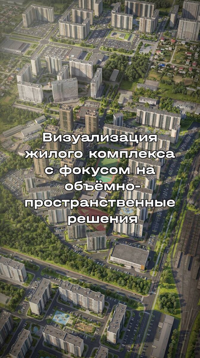 Визуализация жилого комплекса с фокусом на объёмно-пространственные решения квартала и связи с окружением.