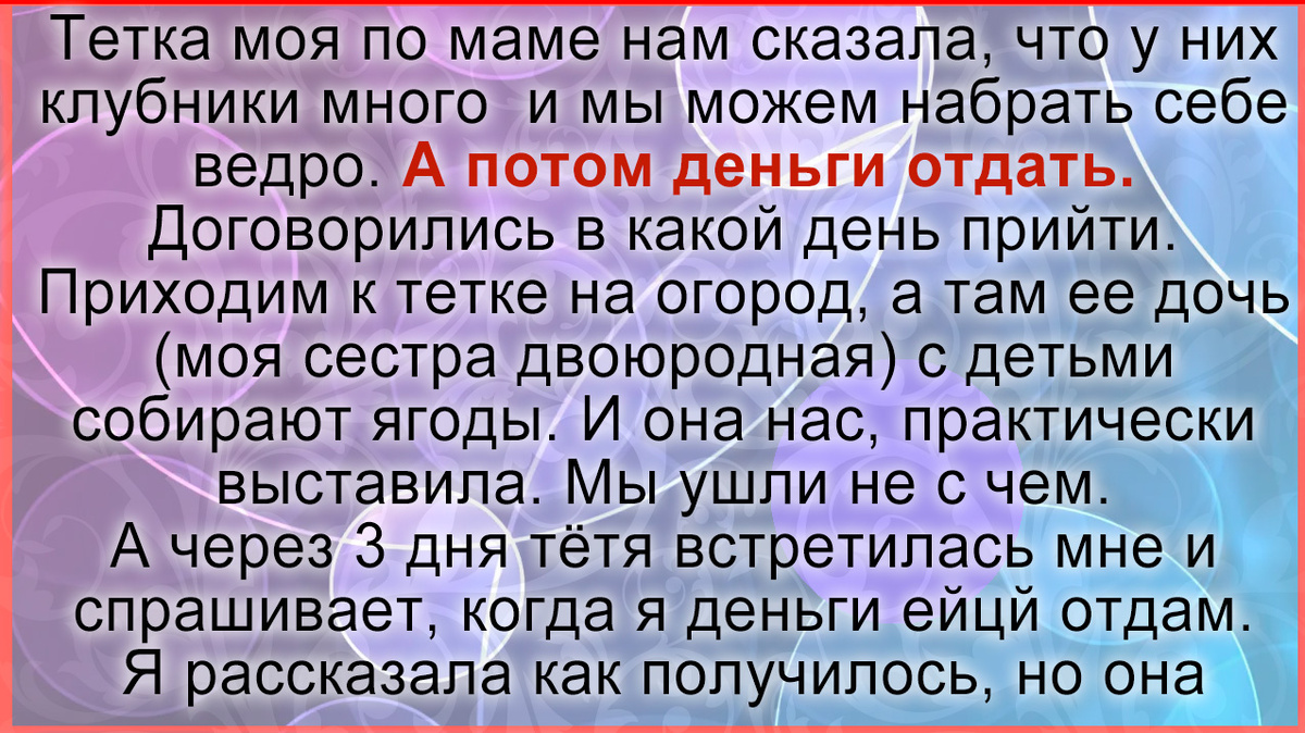 Приходим к тетке на огород, а там дочь тёти, (моя сестра двоюродная) с детьми собирают ягоды. Мы сказали что договорились с тётей на счёт ягод. Дочь её нам объяснила что она сама договорилась продать кому то. Мы ушли не с чем.