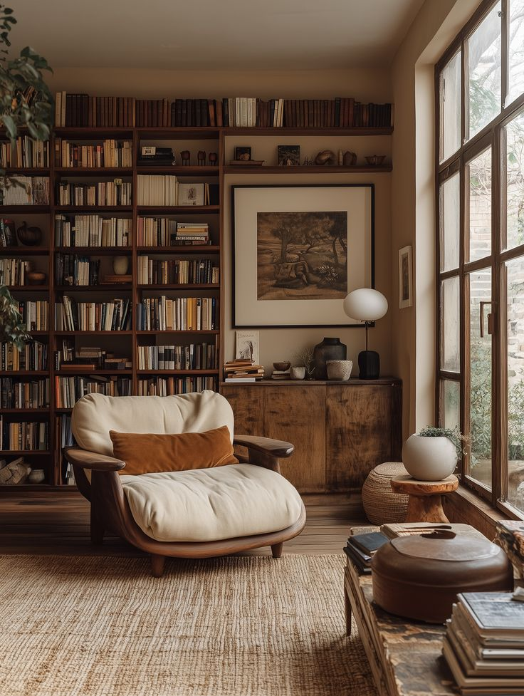 В TS DESIGN STUDIO мы считаем, что домашняя библиотека — это не просто место для хранения книг. Это пространство для чтения, размышлений, уединения. И его дизайн должен работать на эту атмосферу: создавать концентрацию, но не давить, быть функциональным, но не казённым. Разбираем ключевые элементы, которые делают библиотеку красивой и удобной. Библиотека может быть разной по масштабу и назначению: Главное: понять, сколько книг нужно хранить и как вы будете пользоваться библиотекой — только для чтения или ещё и для работы. Стеллажи — основа библиотеки. И здесь важны несколько моментов: Совет: если книг много, часть можно хранить горизонтально стопками — это разбивает монотонность и добавляет ритм. Библиотека без места для чтения — просто склад книг. Нужно кресло (или диван), хороший свет, небольшой столик. Свет в библиотеке должен быть многоуровневым: Библиотека — место для концентрации, поэтому цвета должны быть спокойными, но не скучными. Работают: Не работают: Совет: если стены тёмн