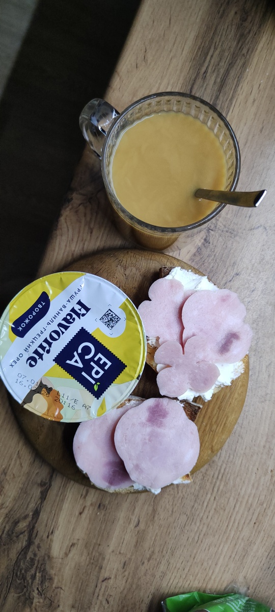 И сладости можно вписать в рацион худеющих. Покажу. На завтрак я ела чиабатту с творожным сыром и ветчиной, творожок