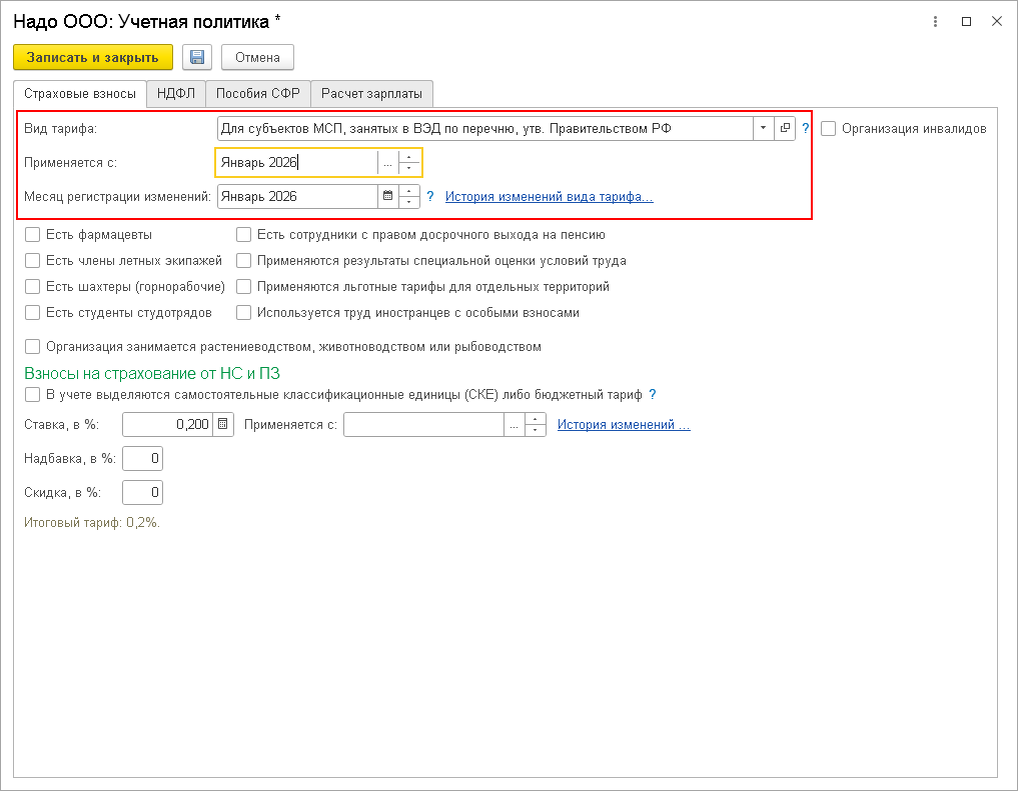 С 01.01.2026 применять пониженный тариф по страховым взносам в размере 15 % к сумме, превышающей полуторакратный МРОТ в месяц могут только субъекты МСП, основный вид деятельности которых указан в ЕГРЮЛ (ЕГРИП) и поименован в Перечне, утв. распоряжением Правительства России от 27.12.2025 № 4125-р. Пониженный тариф применяется при условии, что доля доходов от основного вида деятельности по итогам отчетного периода (квартал) составляет 70 % и более. Для таких льготных плательщиков страховых взносов действуют новые коды в отчетности (РСВ): Код тарифа 20 и коды застрахованных лиц МС, ВЖМС и ВПМС больше не действуют. Если организация имеет право на льготу по новым правилам, необходимо в учетной политике (раздел Настройка – Организации – закладка Учетная политика и другие настройки – ссылка Учетная политика) установить новый тариф. В поле Вид тарифа укажите тариф Для субъектов МСП, занятых в ВЭД по перечню, утв. Правительством РФ. В поле Применяется с укажите месяц январь 2026 года. Если орга