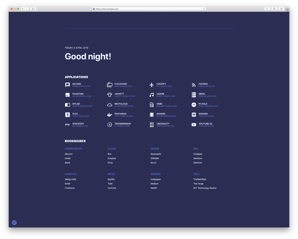sui — это легкая и эстетичная стартовая страница, предназначенная для организации быстрого доступа к вашим локальным сервисам и веб-приложениям. Она идеально подходит как для домашнего сервера (хоумлаба), так и в качестве функциональной замены стандартной «новой вкладки» в браузере. * Персонализация через JSON: Полное управление контентом осуществляется через файлы конфигурации (apps.json, links.json), что позволяет легко переносить настройки между устройствами. * Интеграция с медиа-сервисами: Поддерживает отображение статусов и актуальной информации из таких приложений, как Sonarr и Radarr. * Гибкая система поиска: Возможность добавления собственных поисковых провайдеров (через providers.json) с поддержкой быстрых команд (триггеров). * Встроенные цветовые темы: Переключение между предустановленными темами оформления через удобную кнопку настроек в нижнем углу экрана. * Поддержка Material Design Icons: Использование стандартных иконок для визуализации приложений и категорий закладок. *