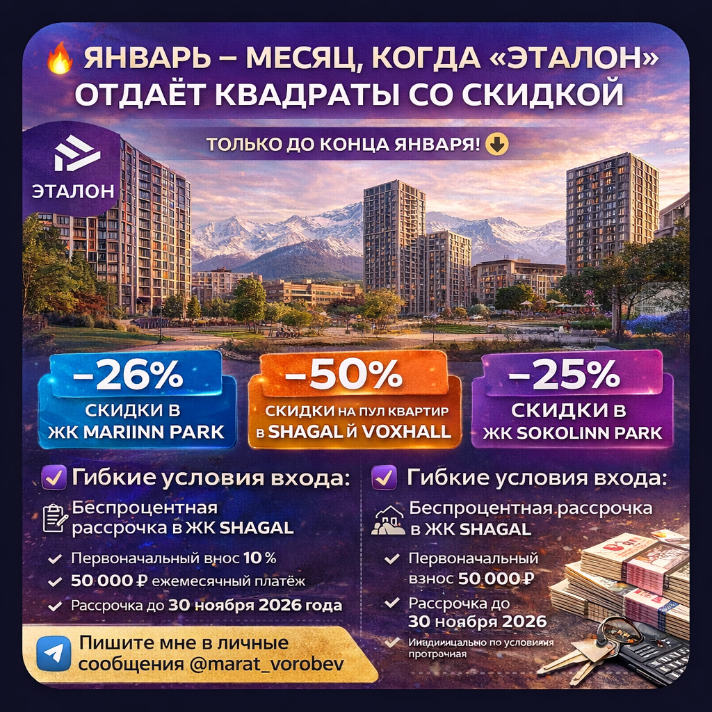 Если вы следите за рынком Москвы и Петербурга, вы знаете: такие условия — РЕДКОСТЬ. Сейчас у застройщика ГК «Эталон» включён режим максимальных предложений — акции, которые реально позволяют зайти в проекты бизнес- и комфорт-класса по ценам, которых потом просто не будет. Вот что действует только до конца января 🔽 🟣 Скидки, которые меняют цифры в расчётах: ▪️ До –26% в ЖК Mariinn Park — формат для жизни и инвестиций в перспективной локации ▪️ До –50% на выделенный пул квартир в проектах Shagal и Voxhall — это уже уровень «входа для инвестора» ▪️ До –25% в ЖК Sokolinn Park — ограниченный пул, самые ликвидные планировки 🟣 Гибкие условия входа: ▪️ Беспроцентная рассрочка в ЖК Shagal — Первоначальный взнос всего 10% — Ежемесячный платёж 50 000 ₽ — Промежуточный платёж — до 30 ноября 2026 года ▪️ Семейная ипотека по сниженной ставке — от 2,5% (считается индивидуально, но условия сейчас одни из самых мягких на рынке) 📌 Почему я обращаю на это внимание своих клиентов: Это как раз тот случ