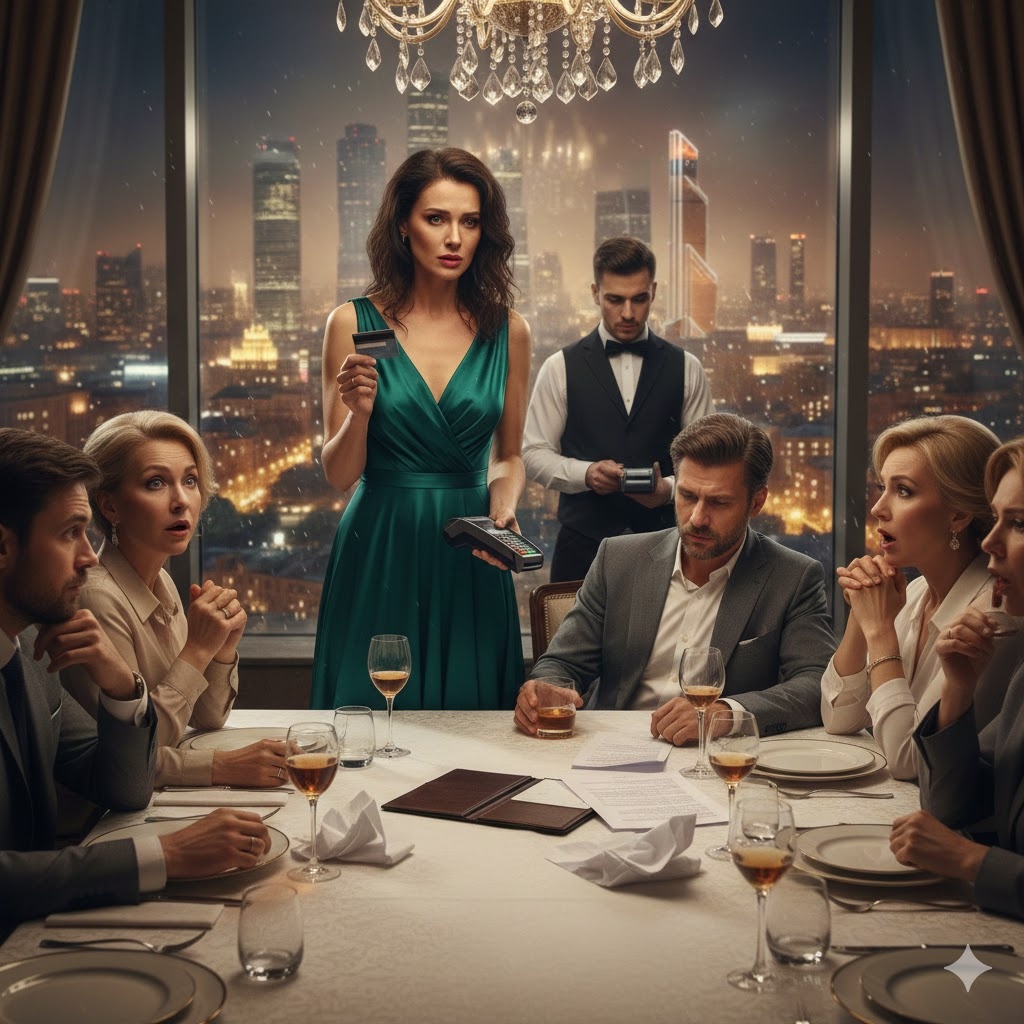 Ресторан «Атмосфера» оправдывал своё название. Сквозь панорамные окна тридцатого этажа Москва расстилалась золотистым ковром, а внутри мягкий свет софитов дробился в гранях хрусталя. Елена сидела во главе стола в шелковом платье цвета глубокого изумруда. Сегодня ей исполнилось тридцать пять.