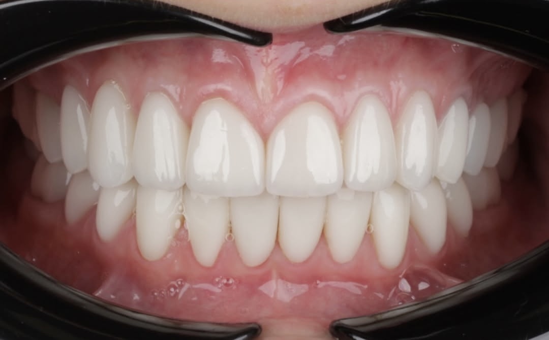 · На 10 передних зубов зафиксировали керамические виниры. Они идеально подобраны по цвету, полупрозрачности и форме, чтобы выглядеть естественно.