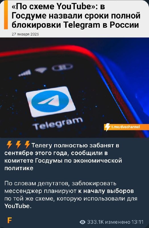 ? В частности, тг-канальчики типа Двача постят без важного дополнения от самого Делягина, кто это всё и запостил: Мессенджер Telegram могут полностью заблокировать в России по схеме, похожей на блокировку видеохостинга YouTube, заявил зампред комитета Госдумы по экономической политике Михаил Делягин. По его словам, это может произойти к сентябрю 2026 года, когда в стране пройдут выборы. Депутат заметил, что никаких «инсайдеров» у него нет, это его личные предположения Telegram | Дзен | MAX
