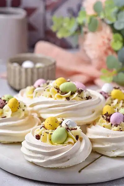 Эти простые в приготовлении пасхальные безе-гнезда - восхитительное лакомство, которое понравится всем. Безе с начинкой из подслащенного сливочного сыра и легкой воздушной текстурой станут прекрасным дополнением праздничного пасхального стола. Вот рецепт пасхального десерта. Продукты необходимые для приготовления:
