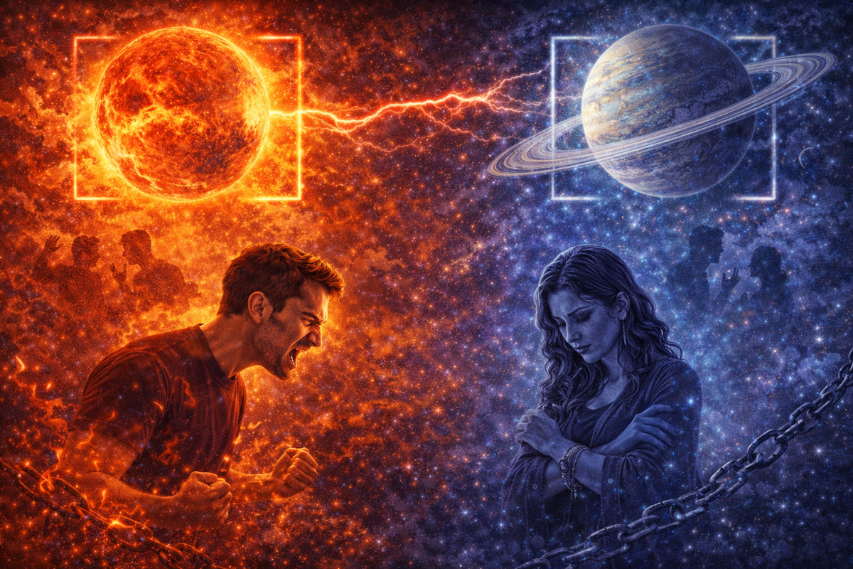 Таким образом, Марс и Сатурн символизируют два противоположных начала: Марс — это энергия действия и инициативы, а Сатурн — это энергия ограничения, структуры и ответственности. Когда эти два аспекта сталкиваются в синастрии, возникает напряжение, которое может быть как разрушительным, так и преобразующим.