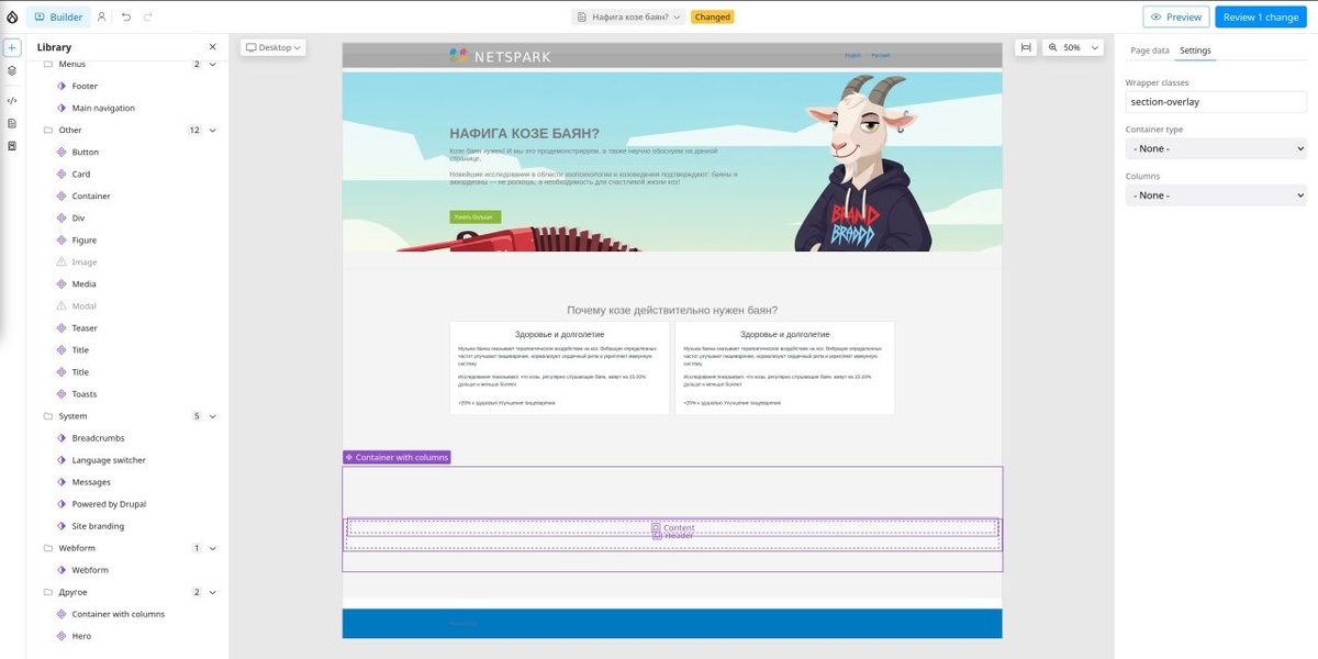Играюсь с Canvas, новым визуальным конструктором страниц под Drupal, первая версия которого вышла в декабре. Вскоре должна получиться статья на тему, а может даже и видео — не решил еще. Пока вкратце: — прикольно; — польза от компонентной верстки / SDC / сторибуков и этого всего — возросла; — интеграция с остальной инфраструктурой Дру пока невысока; — есть конечно немного багов.