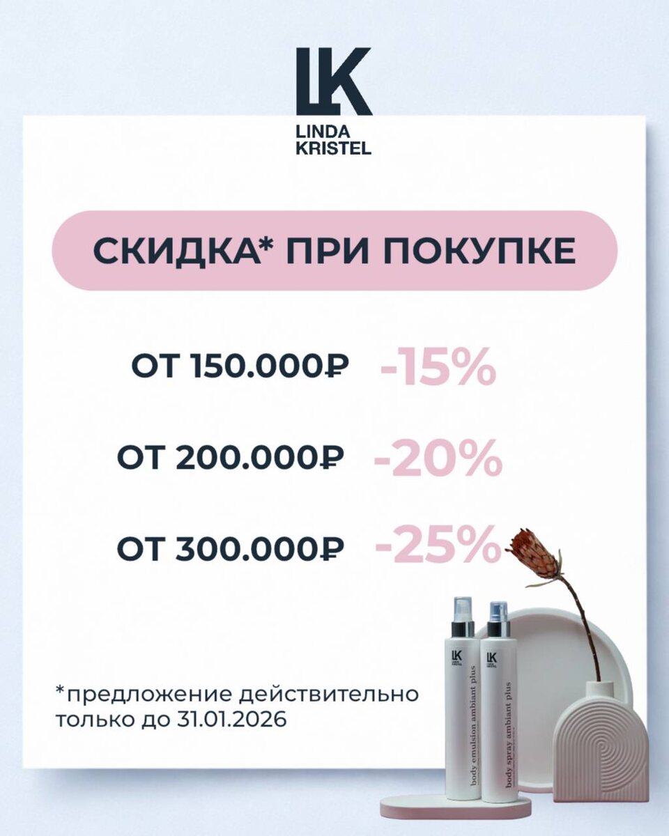 При покупке продукции Linda Kristel действуют специальные условия: — от 150 000 ₽ — скидка 15% — от 200 000 ₽ — скидка 20% — от 300 000 ₽ — скидка 25% Предложение действительно до 31 января 2026 года. Для оформления заказа и подбора оптимальных условий свяжитесь с вашим менеджером — он с радостью поможет.🤩🤍 В предложении указаны оптовые цены, подробности уточняйте 8 (495) 988-3737