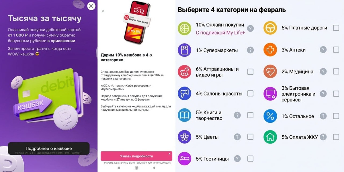 % 😂 Во-первых, ОТП Банк. В приложении замечена акция «тысяча за тысячу»: оплачиваешь покупки дебетовой картой от 1 000 руб. — возвращают 1 000 руб. бонусами. Период акции — с 26.01.26 по 24.02.26. Предложение персональное, баннер есть не у всех, лучше проверить у себя на главной или при входе. 🎁 До 2500 за карты ОТП 〰〰〰 🏦 Во-вторых, УБРиР. По карте некоторым прилетает персоналка с дополнительным кэшбэком 10% сразу в четырёх категориях помимо стандартных: ✅ АЗС. ✅ Аптеки. ✅ Кафе и рестораны. ✅ Супермаркеты. Покупки для повышенного кэшбэка — с 27 января по 2 февраля. ◻️ И не забываем про категории на февраль от УБРиР: в приложении уже доступен выбор. С платной подпиской доступна категория 10% на интернет-покупки (макс 600) — редкая и полезная история + есть 5% на ЖКХ, что сейчас тоже встречается нечасто. Лимиты по кэшбэку такие: 300 руб. — на ЖКХ, 500 руб. — на каждую другую категорию, 3 000 руб. — суммарно в месяц. 🎁 1000 рублей за карту MY LIFE ✅ Подписаться | 📊 Все акц