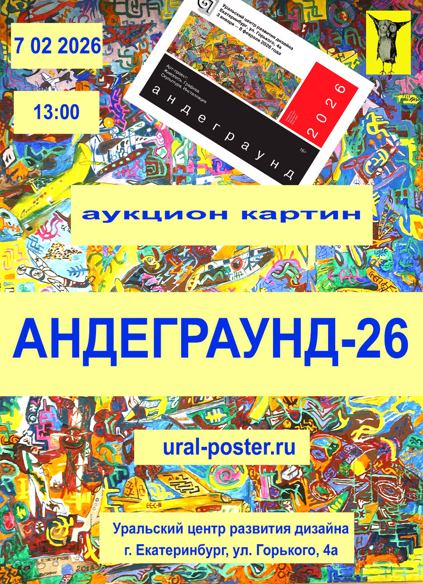 Приглашаем вас принять участие в аукционе картин «Андеграунд-26», который состоится 7 февраля 2026 года в 13:00. Место проведения: Екатеринбург, ул. Горького, 4а, Уральский центр развития дизайна. Трансляция аукциона будет доступна в прямом эфире на нашей странице ВКонтакте: vk.com/salavat61. Обратите внимание: — Стартовые цены на лоты действительны до 15:00 по Свердловскому времени. — Ставки во время эфира можно делать по телефону: +7 966 705 64 75. — Предварительные ставки принимаются по телефону: +7 912 615 02 16. Предварительный просмотр картин доступен на сайте: https://ural-poster.ru/ Приём картин для аукциона проводится 7 февраля с 11:00 до 12:30, в конференц-зале по адресу: ул. Горького, 4а. По всем вопросам обращайтесь по телефону: +7 912 615 02 16. Ждём вас на мероприятии!