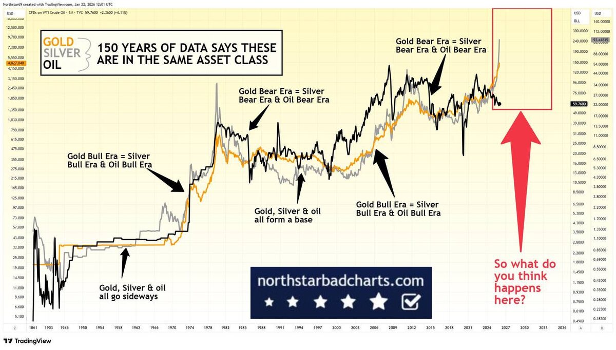 ЭТО ЦИКЛ Если вы уверены, что нефть останется ниже $200 за баррель в ближайшие 5–8 лет, вы, по сути, говорите, что на этот раз 150 лет истории не работают. А история говорит довольно однозначно. Золото, серебро и нефть — это один и тот же класс активов. Реальные деньги и реальная энергия. Меняются фазы — меняется лидер, но структура цикла повторяется снова и снова. Что мы видим сейчас: — Золото уже переписало реальную цену с учётом инфляции — Серебро только начинает догонять — Нефть пока отстаёт, но именно так это выглядело и раньше в начале сырьевых суперциклов Ключ не в том, что «нефть вырастет». Ключ в соотношении золото / нефть. И здесь логика простая и неприятная: Если золото удерживает текущие уровни (а причины его роста — геополитика, фрагментация мира, недоверие к долгам — никуда не исчезли), то нефть либо: — резко догоняет вверх — либо система ломается через дефицит энергии и скачок цен Исторически другого выхода не было. Почему рынок до сих пор спокоен? Потому что