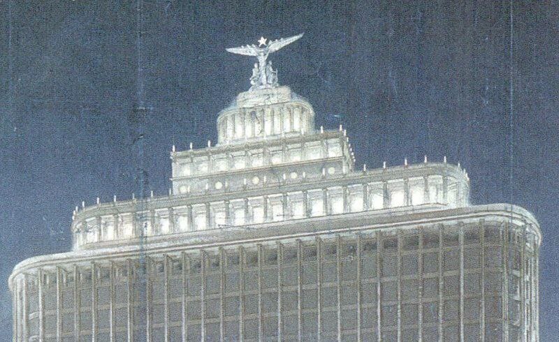 ΠΈΡΠ΅ΠΊΡΠΎΡ ΠΠΌΠΈΡΡΠΈΠΉ Π§Π΅ΡΡΠ»ΠΈΠ½ Π² 1934 Π³ΠΎΠ΄Ρ ΠΏΡΠ΅Π΄Π»ΠΎΠΆΠΈΠ» ΠΊΠΎΠ½ΡΠ΅ΠΏΡΠΈΡ ΠΌΠΎΠ½ΡΠΌΠ΅Π½ΡΠ°Π»ΡΠ½ΠΎΠ³ΠΎ Π·Π΄Π°Π½ΠΈΡ Π°ΡΡΠΎΠ΄ΠΈΠ½Π°ΠΌΠΈΡΠ΅ΡΠΊΠΎΠΉ ΡΠΎΡΠΌΡ. π΅ΠΠ½ΡΡΡΠΈ ΠΏΠ»Π°Π½ΠΈΡΠΎΠ²Π°Π»ΠΈ ΡΠ°Π·ΠΌΠ΅ΡΡΠΈΡΡ Π°Π΄ΠΌΠΈΠ½ΠΈΡΡΡΠ°ΡΠΈΠ²Π½ΡΠΉ ΠΏΠ΅ΡΡΠΎΠ½Π°Π» ΠΈ ΠΎΠ±ΠΎΡΡΠ΄ΠΎΠ²Π°ΡΡ Π·Π°Π»Ρ Π΄Π»Ρ ΠΊΡΠ»ΡΡΡΡΠ½ΠΎΠ³ΠΎ Π΄ΠΎΡΡΠ³Π° ΡΠΎΡΡΡΠ΄Π½ΠΈΠΊΠΎΠ² Π°Π²ΠΈΠ°ΠΊΠΎΠΌΠΏΠ°Π½ΠΈΠΈ. π΅ΠΡΠΎΠ΅ΠΊΡ Π½Π΅ Π±ΡΠ» ΡΠ΅Π°Π»ΠΈΠ·ΠΎΠ²Π°Π½, Π½ΠΎ Π§Π΅ΡΡΠ»ΠΈΠ½ ΠΈΡΠΏΠΎΠ»ΡΠ·ΠΎΠ²Π°Π» Π½Π΅ΠΊΠΎΡΠΎΡΡΠ΅ ΠΈΠ· Π½Π°ΡΠ°Π±ΠΎΡΠΎΠΊ ΠΏΡΠΈ ΡΡΡΠΎΠΈΡΠ΅Π»ΡΡΡΠ²Π΅ ΠΠ΅Π»ΠΎΠ³ΠΎ Π΄ΠΎΠΌΠ° Π² 60-Ρ