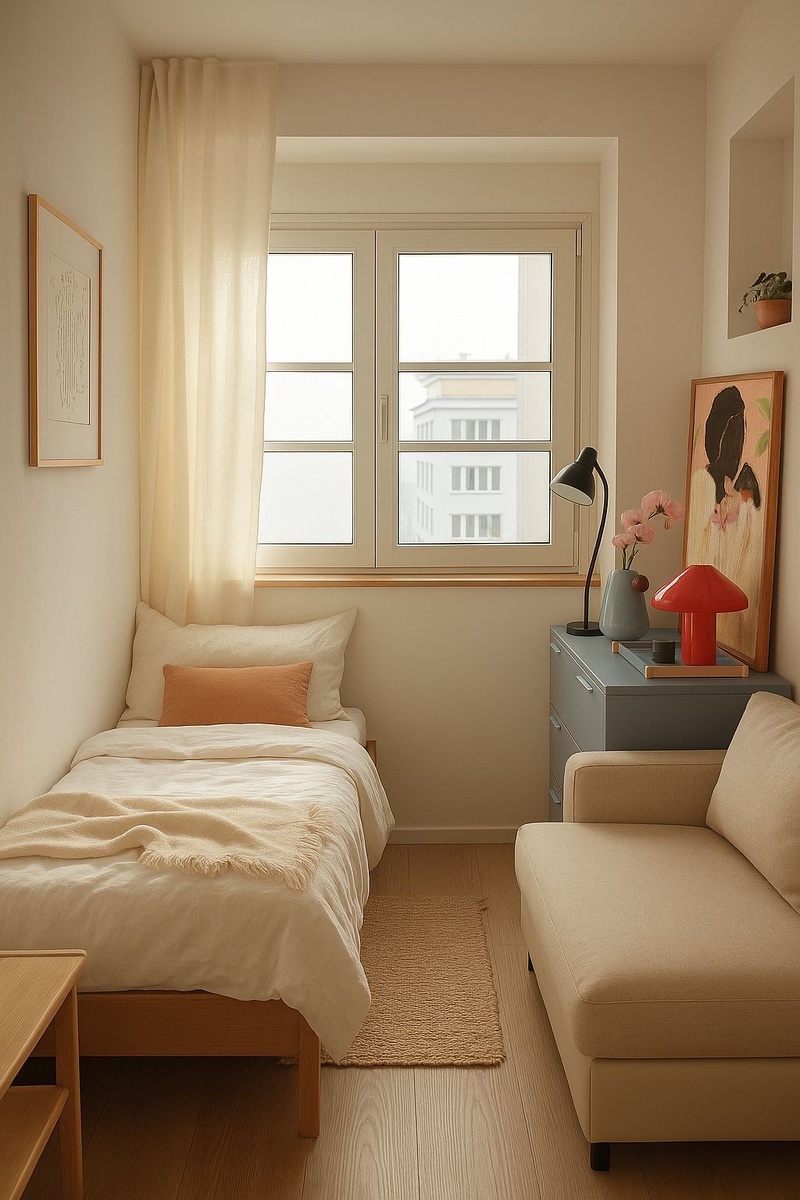 Формула уюта: Откажитесь от массивных темных штор от пола до потолка в маленькой комнате. Выбирайте легкие рулонные или римские шторы, пропускающие свет. Комната сразу вздохнет!