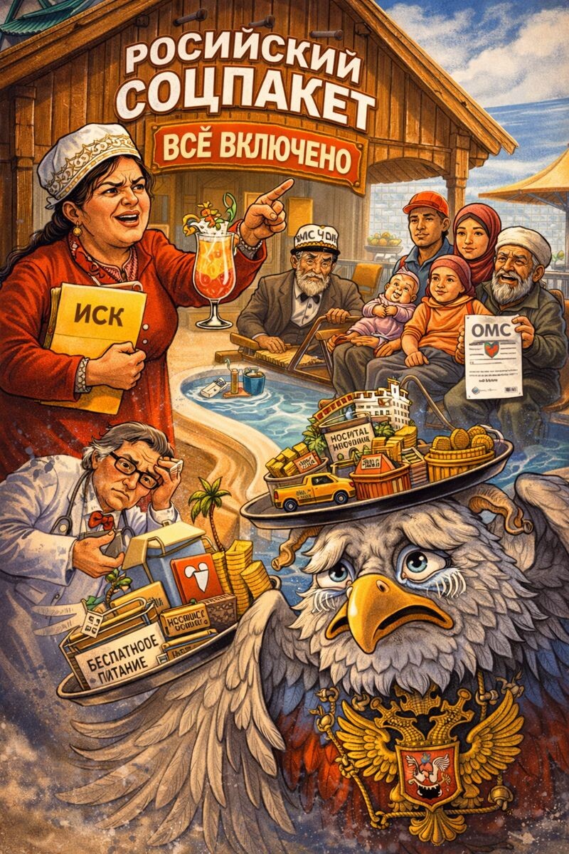 Киргизия подала иск к России в суд ЕАЭС. Причина — Россия, представьте себе, не спешит раздавать полисы ОМС всем членам семей трудовых мигрантов. Не только тем, кто работает, платит взносы и налоги, а вообще — всей родне, которая приехала «за компанию». С точки зрения киргизских властей, это — вопиющее нарушение соглашений.