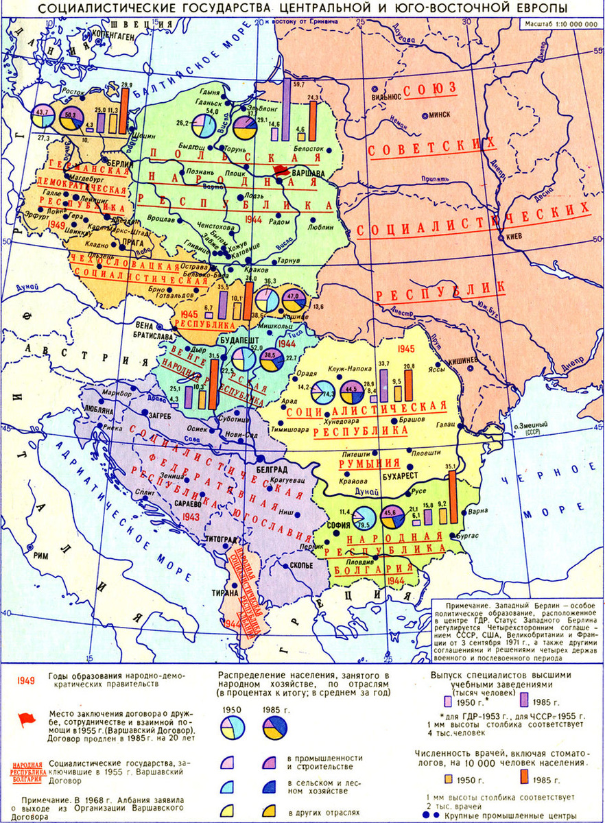 Социалистические государства центральной и юго-восточной Европы. Цит. по: Чумалова Г. Г., Дулова Е. В. Атлас новейшей истории зарубежных стран. 10–11 кл. одиннадцатилетней школы. — М.: Картография ГУГК СССР, 1991. — С. 31