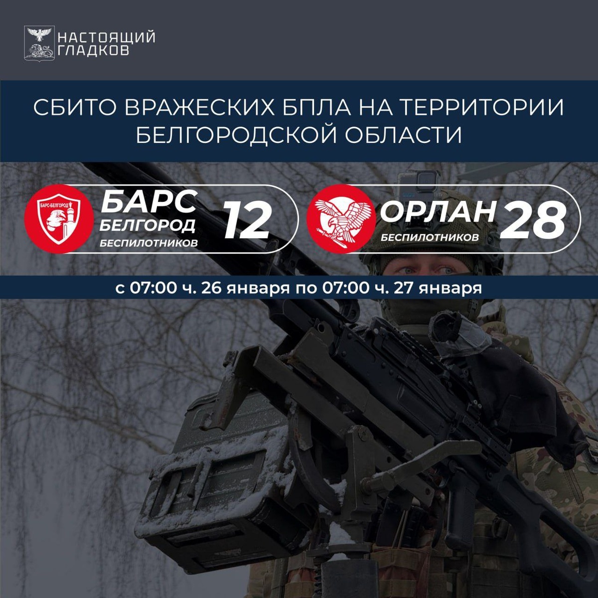 » С 07:00 ч. 26 января по 07:00 ч. 27 января ликвидированы 40 беспилотников «БАРС-Белгород» — 12 беспилотников: 📍 подавлены РЭБ: — Шебекинский округ: 6 FPV-дронов. 📍 сбиты из стрелкового оружия: — Борисовский округ: 2 FPV-дрона; — Грайворонский округ: 1 FPV-дрон; — Шебекинский округ: 2 FPV-дрона. 📍 средствами противодействия БПЛА сбит: — Белгородский округ: 1 разведывательный БПЛА «Мара». «Орлан» — 28 беспилотников: 📍подавлены РЭБ: — Белгородский округ: 3 FPV-дрона; — Валуйский округ: 1 FPV-дрон; — Волоконовский округ: 4 FPV-дрона. 📍 сбиты из стрелкового оружия: — Борисовский округ: 1 FPV-дрон; — Грайворонский округ: 5 FPV-дронов; — Шебекинский округ: 8 FPV-дронов. 📍 подавлены РЭБ совместными усилиями подразделения «ОРЛАН» и бойцов самообороны: — Шебекинский округ: 6 FPV-дронов. Благодарю всех бойцов за эффективную работу по ликвидации вражеских беспилотников! Побед