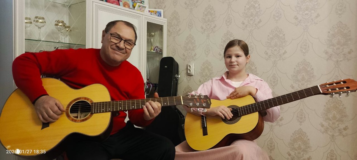 Волшебник Сулейман колдует над гитарой, а Викуля пока учится