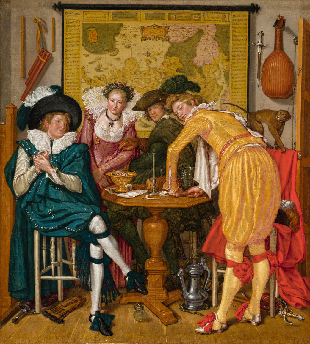 Немногочисленные сохранившиеся картины голландского художника Виллем Питерсон Бёйтевех (1591/92-1624), которых насчитывается всего около дюжины, иллюстрируют переход от нравоучительных аллегорических изображений к самостоятельным жанровым картинам. Эта картина, написанная около 1620 года, всё ещё демонстрирует черты маньеризма в ярких цветах модных в то время костюмов и несколько манерных движениях, но уже создает впечатление реалистичного изображения элегантной сцены. Однако символические значения показанных предметов всё ещё были понятны ценителям искусства во времена Бёйтевеха, и они могли легко узнать в женщине зрелой красоты, развлекающей весёлых молодых людей, образ Владычицы Мира. В средневековой иконографии она олицетворяет соблазн греховных земных удовольствий и изображается с земным шаром на голове, который здесь, вероятно, заменен картой. Предметы на столе, на полу и на стене, а также обезьяна, также могут быть истолкованы как символы пяти чувств. Картина имеет размер 72,