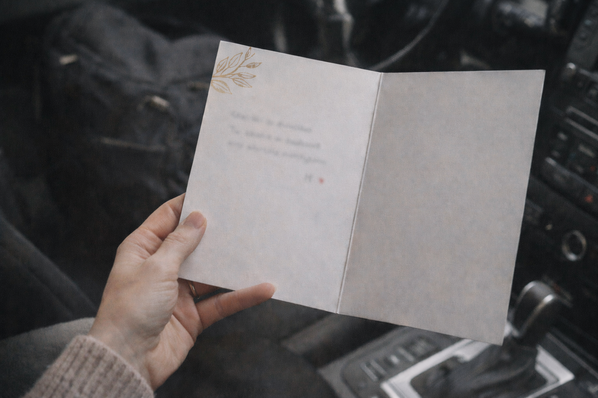 Она была без конверта. Значит, её не собирались кому-то отправлять. Её держали при себе. Так носят не «поздравление коллеги». Так носят что-то личное, что не хочется терять.