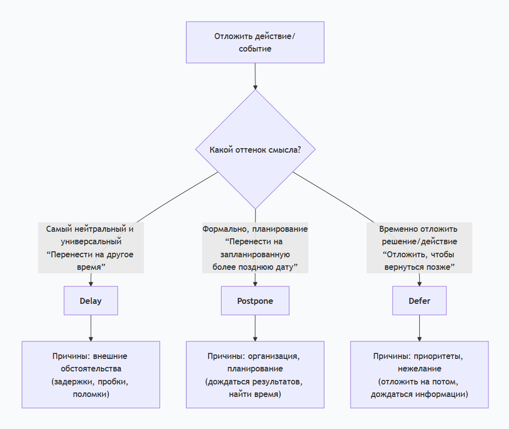 Все три слова означают «отложить на более поздний срок», но есть важные смысловые и стилистические различия. Вот простая схема для понимания, а ниже — подробное объяснение: Суть: Часто непреднамеренная или вынужденная задержка из-за внешних обстоятельств. Акцент на процессе ожидания и срыве первоначальных сроков. Коннотация: Чаще негативная (задержка рейса, задержка в работе). Причина: Обычно внешние факторы: пробки, технические неполадки, бюрократия, чья-то медлительность. Примеры:
