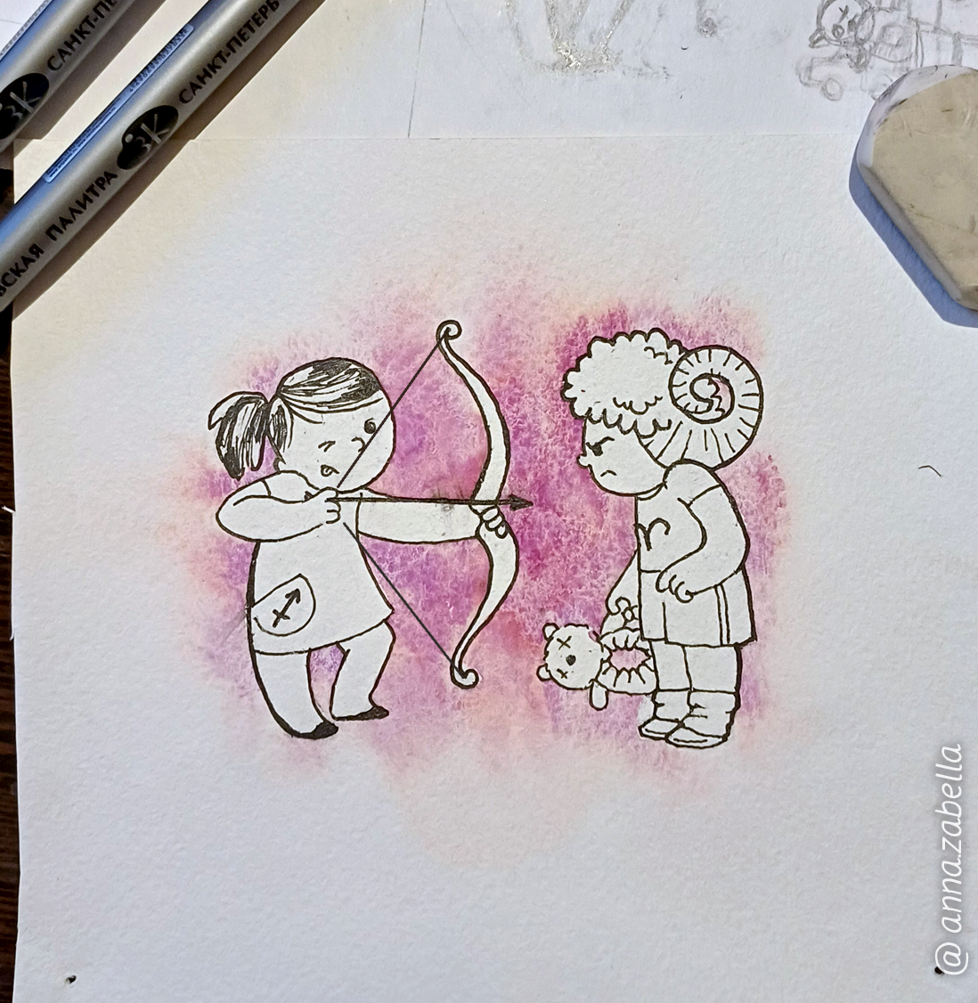 Сегодня делюсь процессом создания иллюстрации с милыми зодиакальными малышами — Стрельцом и Овном 🏹🐏 1. Эскиз Начинаю с лёгкого карандашного наброска. Формы делаю округлыми — так персонажи выглядят по-детски. Уже здесь важно заложить характер: сосредоточенность Стрельца и спокойное упрямство Овна. 2. Маскирующая жидкость По карандашному рисунку наношу маскирующую жидкость на фигурки детей. Она защищает персонажей от заливки и помогает сохранить чистые светлые формы. Обязательно жду полного высыхания. 3. Акварельная заливка Фон выполняю гранулирующей акварелью, позволяя цвету свободно растекаться и создавать мягкую текстуру вокруг персонажей. 4. Снятие маски После полного высыхания аккуратно снимаю маску — под ней остаётся чистая бумага. 5. Линер и детали И только теперь обвожу рисунок чёрным линером, добавляю мимику, тени и мелкие акценты. Именно на этом этапе персонажи «оживают». Если вам интересно наблюдать за процессом создания иллюстраций — напишите в комментариях 💜
