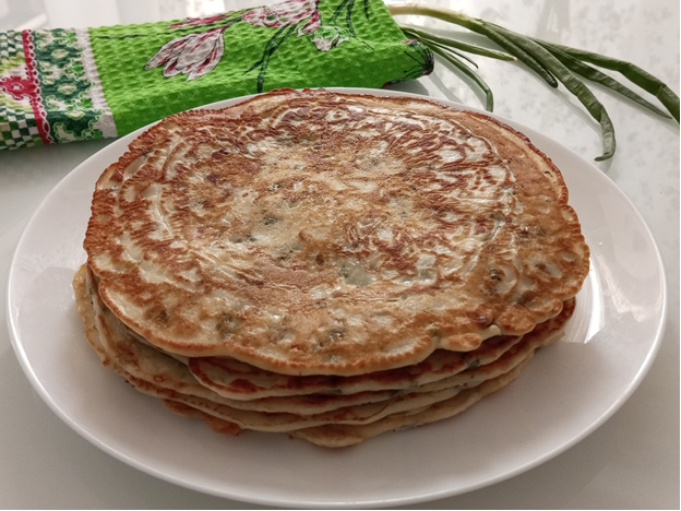 Если нравится мучное на кефире, то и такие лепешки понравятся. Лепешки готовятся быстро, буквально за 15 минут, а кроме того их можно пожарить оладьями и менять начинки. Ингредиенты: - кефир – 500 мл.; - яйца – 2 штуки; - соль – ¼ чайной ложки; - мука – 6,5 полных столовых ложек (с горкой); - зеленый лук – 1 пучок; - сыр твердых сортов – 100 гр.; - растительное масло для жарки лепешек. В глубокой емкости вилкой или венчиком взболтать яйца с солью добавить кефир, муку, смешать до однородности, отставить в сторону. Масса должна получиться как на оладьи. Сыр натереть на мелкой терке. Лук мелко нарезать. К получившейся смеси добавить нарезанный лук, натертый сыр. Перемешать. Хорошо нагреть сковороду, добавить немного растительного масла, 4 ст. ложки получившейся массы равномерно распределить по сковороде, обжаривать с двух сторон среднего нагрева примерно по 1,5 минуты каждой стороны. Лепешки формировать толстенькими, сформированная тонкая лепешка может порваться при переворачивании. Получ